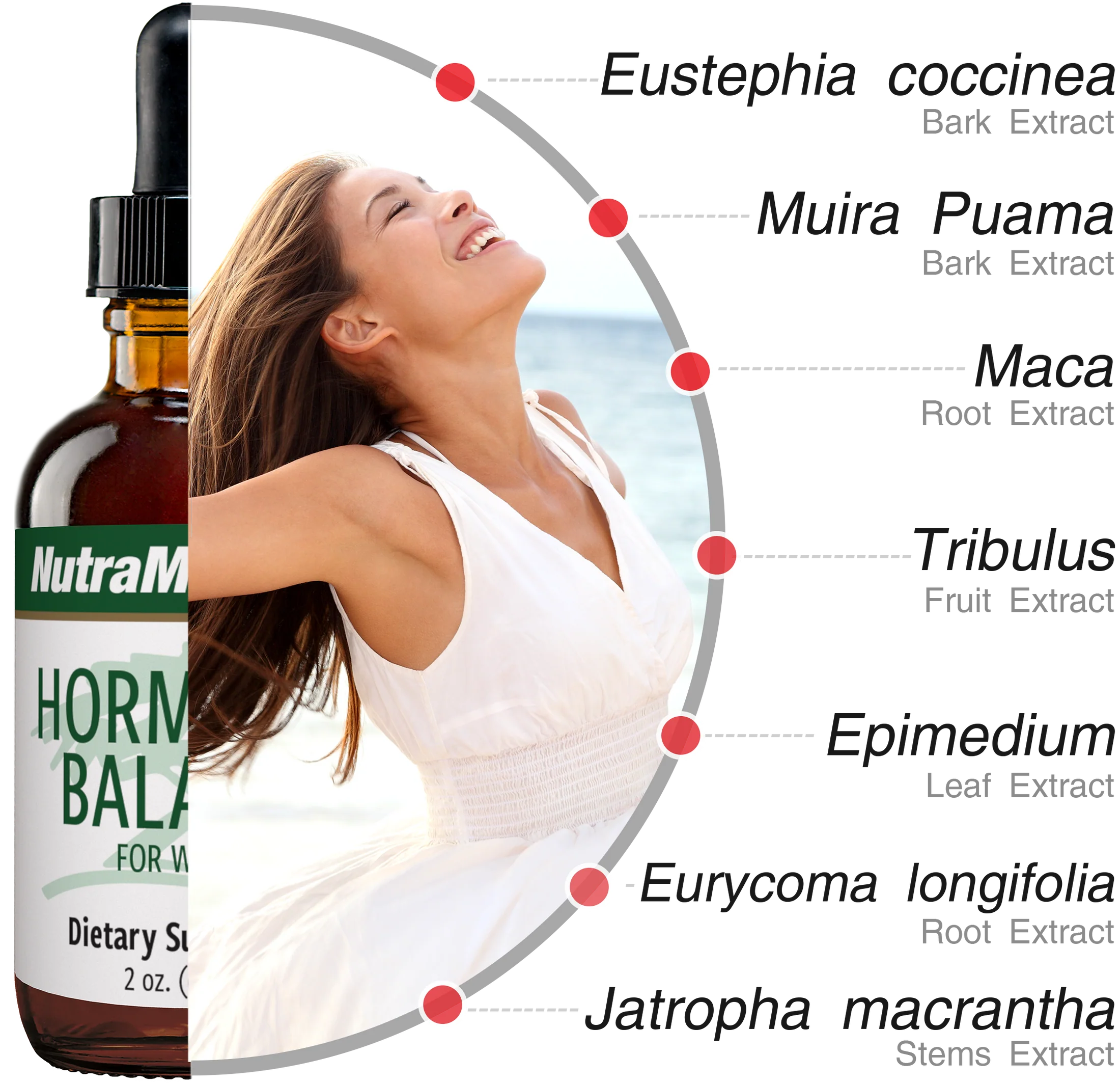 Hormonal Balance combines seven carefully selected plant extracts traditionally used to promote female health: epimedium leaves, tribulus fruit, jatropha stem, muira puama bark, maca root, eurycoma root, and eustephia bark.